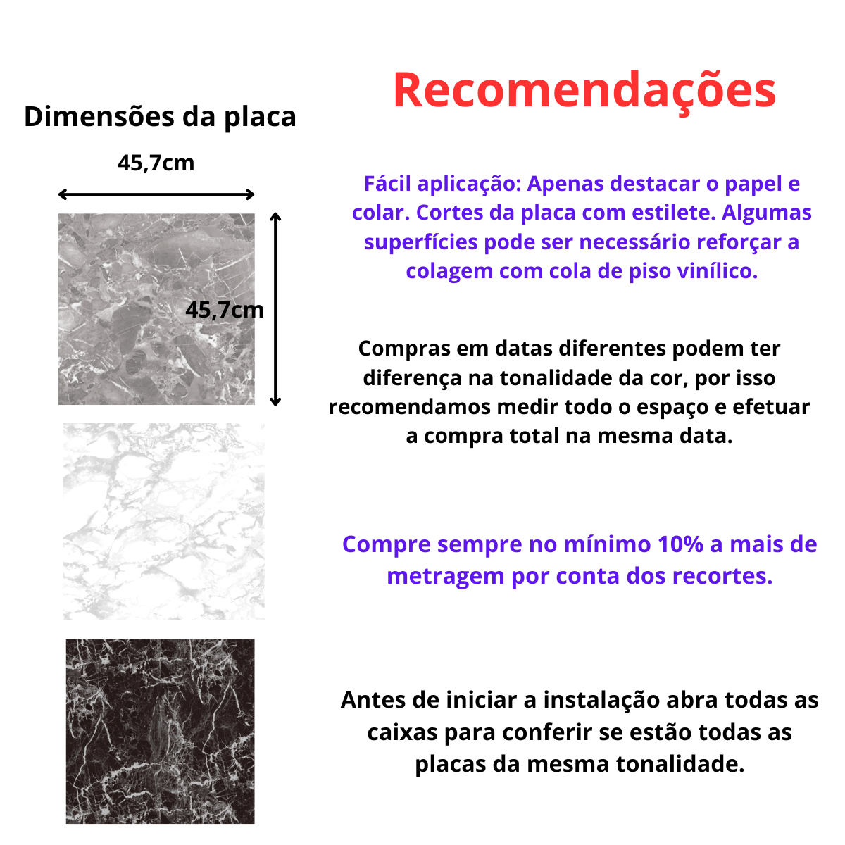 O piso vinílico em placas autocolante no tamanho de 45,7 cm x 45,7 cm é uma solução prática e elegante para revestimento de ambientes internos. Feito de PVC, é uma opção que combina durabilidade com facilidade de instalação, já que dispensa o uso de cola ou argamassa, sendo necessário apenas remover o adesivo e fixar diretamente no chão.