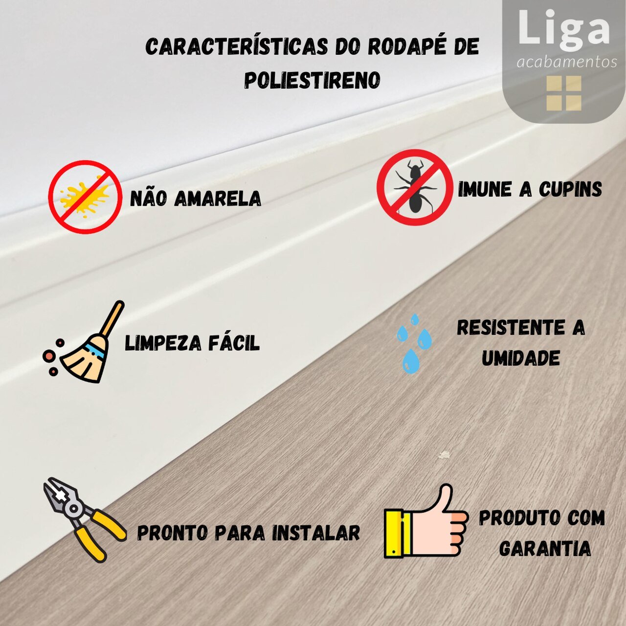 O rodapé de poliestireno da Liga Acabamentos é a melhor opção para o acabamento da sua parede pois é feito com material de poliestireno virgem, reforçado,garantindo uma fácil instalação sem empenamento e amarelamento posterior das barras.